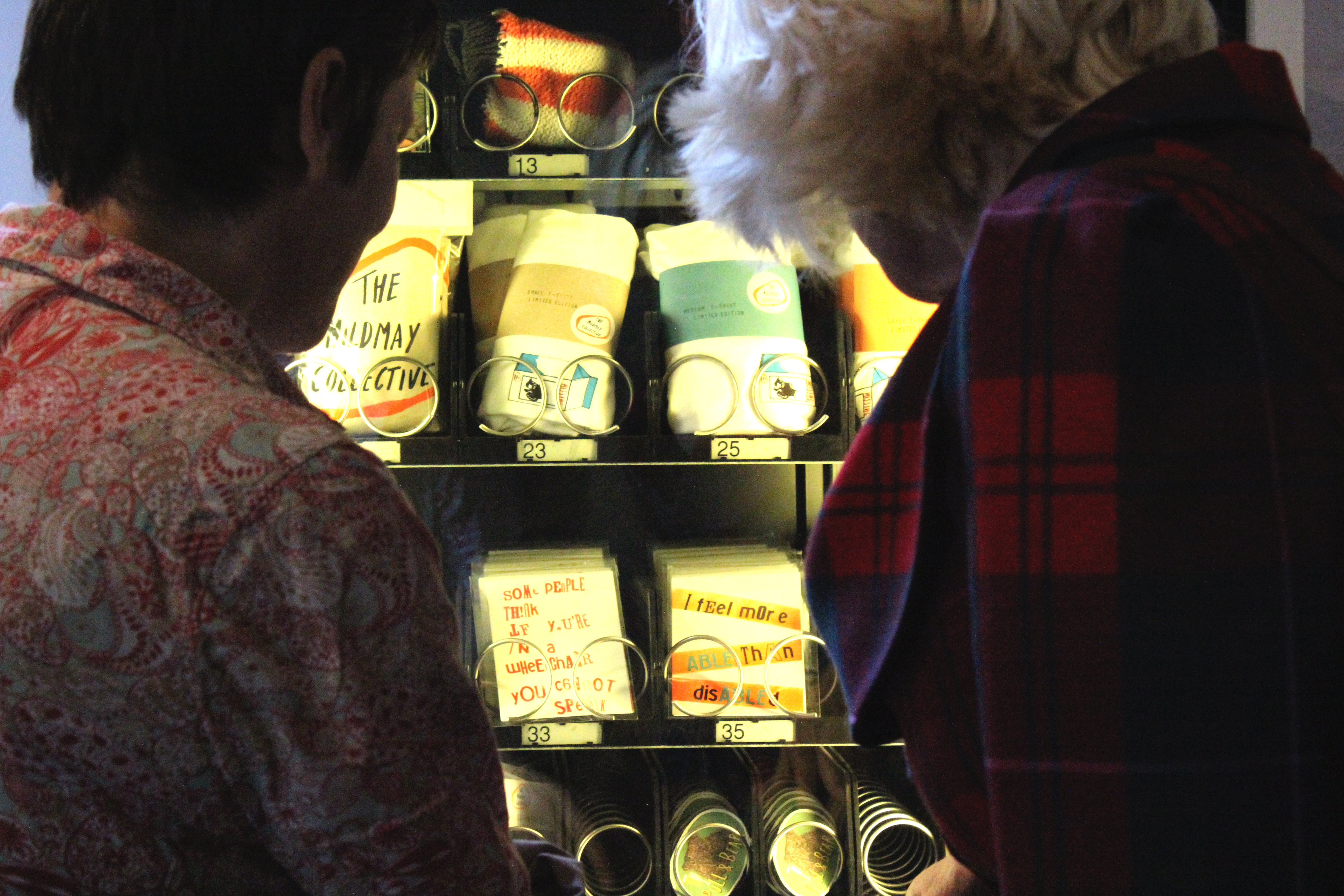 One of the key artworks of the exhibition was a vending machine which housed a collection of smaller artworks for sale at an affordable price: branded t shirts and tote bags, memorabilia badges from the Southend trip, knitted scarves and dog coats and postcards amongst other things. We commissioned Eyup Digital to design an app to work with the machine which was displayed on a tablet so viewers could find out what each artwork was and the story behind it.